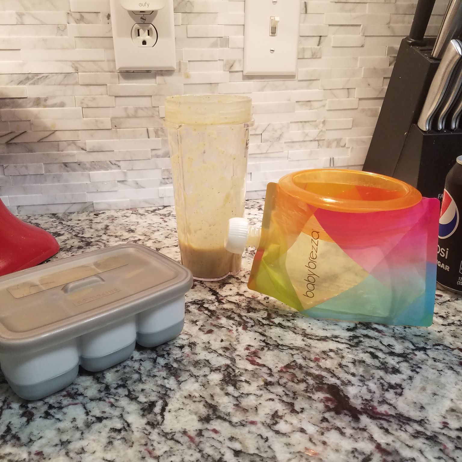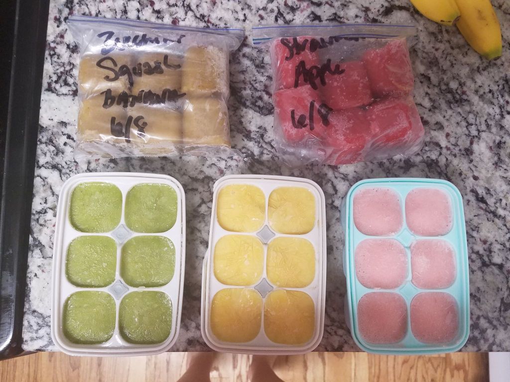 The freezer storage containers I use are the Skip Hop Easy-Fill Freezer Trays. I have 3 of them and I like to fill them all at once and have them freeze overnight. I blend my baby food using a Ninja Bullet blender. The freezer storage containers hold 12oz of food and the Ninja Bullet blending cup is clearly labelled and hold up to 16oz. Since I am making multiple types of food in one sitting I like to make recipes that have similar ingredients.