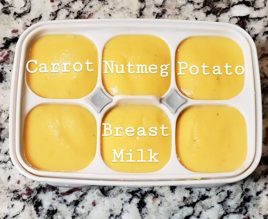 I put the frozen milk in first and add the baby food ingredients on top. I sometimes add more breast milk to the mix to get the consistency just right. There are some baby foods that I do not add breast milk to, at least not as much; oatmeal for example. This is because of the consistency. I don’t want it to be too watery or too thick.