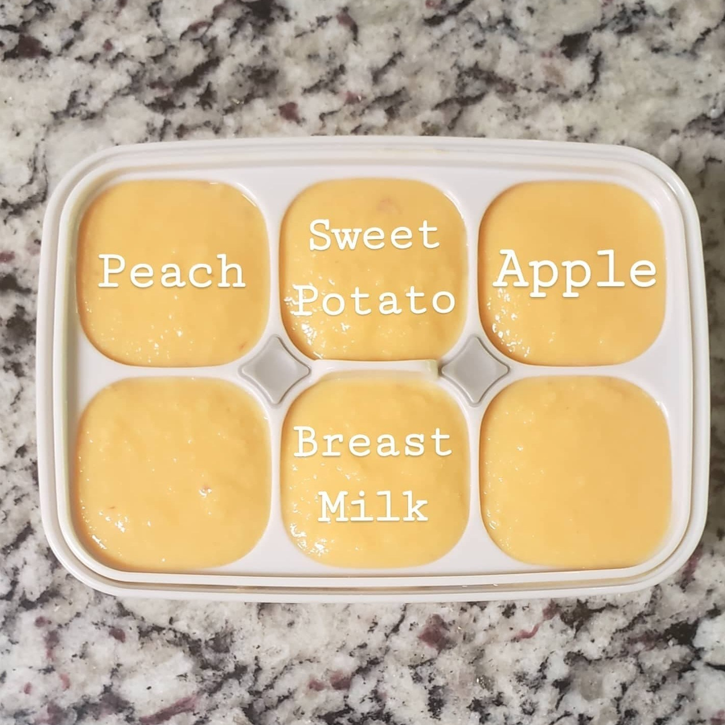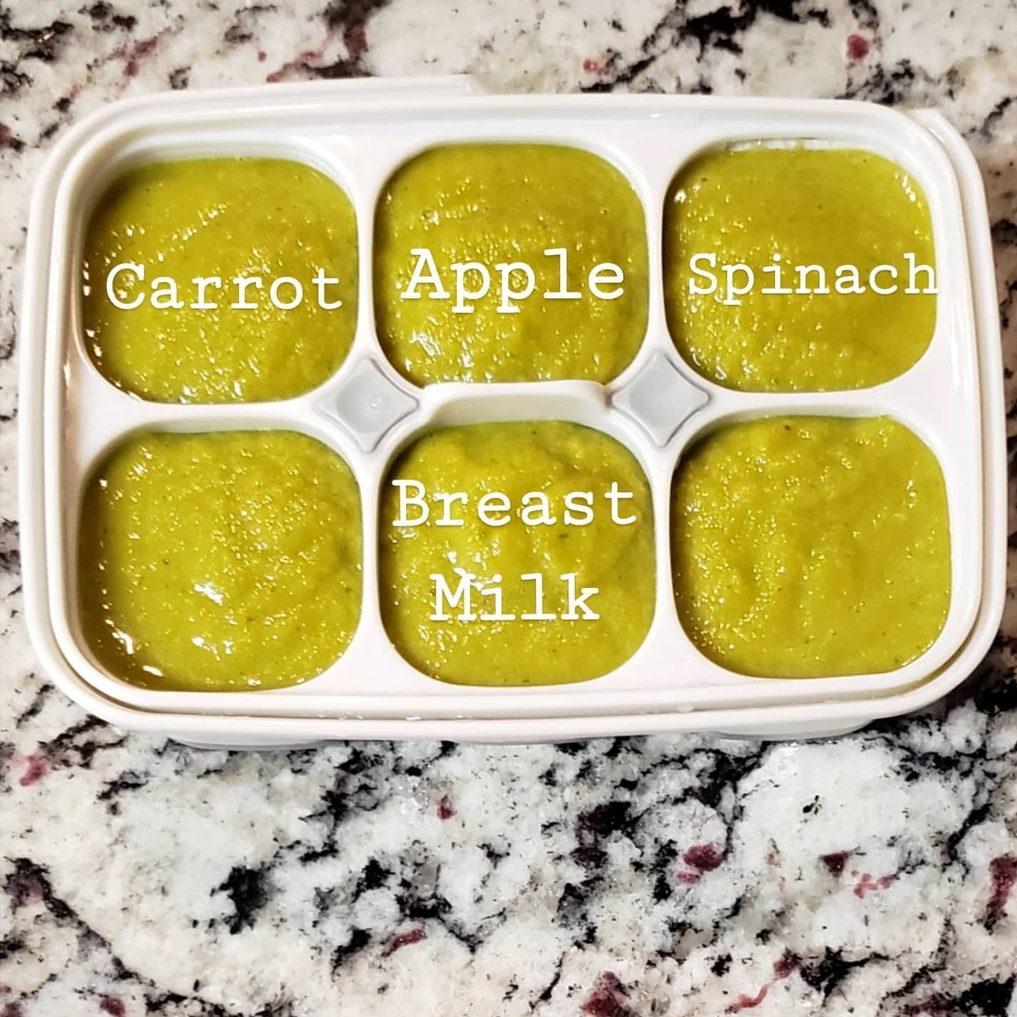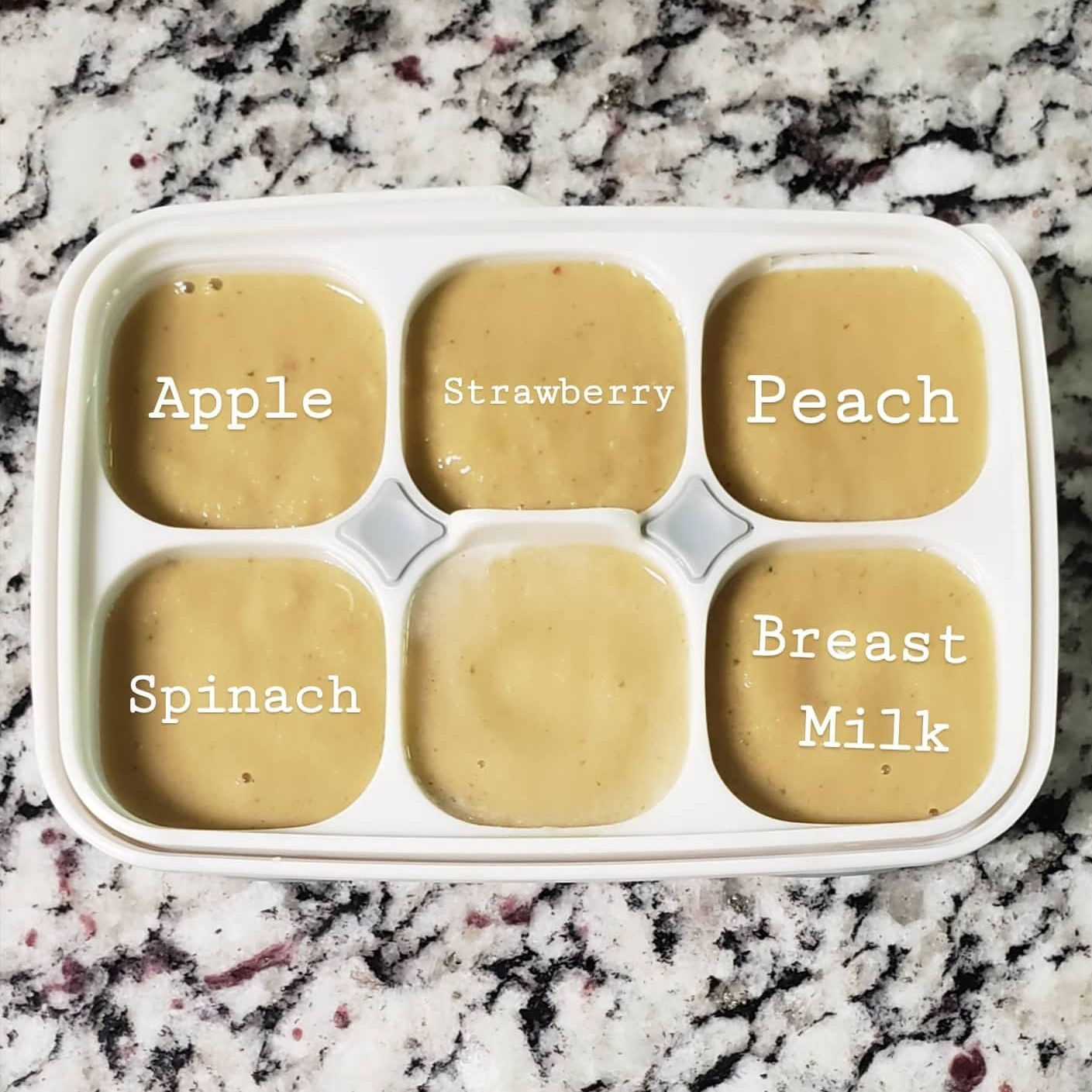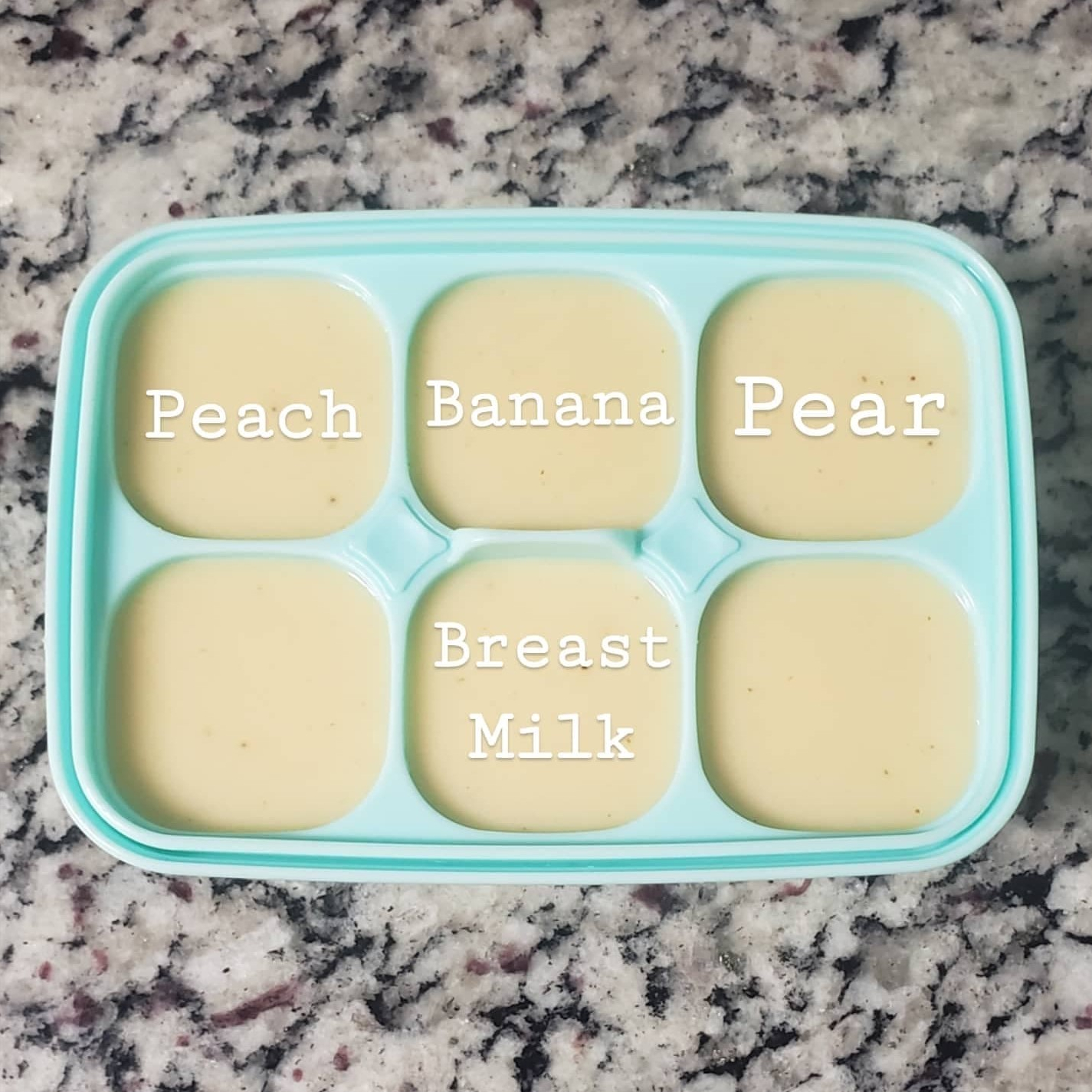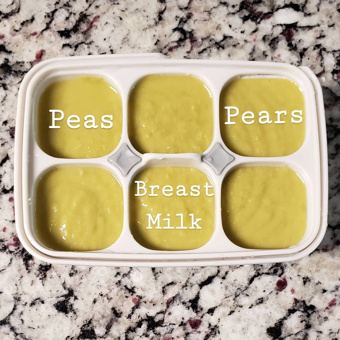 I love making homemade baby food! I use a ninja bullet to blend a variety of fresh and frozen food with breast milk! Any excuse to give more breast milk to my little one! Each of these containers are 12 oz (six 2oz pods) and I put about 5oz of breast milk in each batch. I freeze the pods and take out what I will need for the next day and put it in the fridge before bed. I use fresh produce whenever possible but frozen or canned fruits and veggies work in a pinch as well! These freezer meals will be good for 3mo in the freezer and she currently goes through about 18oz of food per day (she is 8 months and I am still breastfeeding).