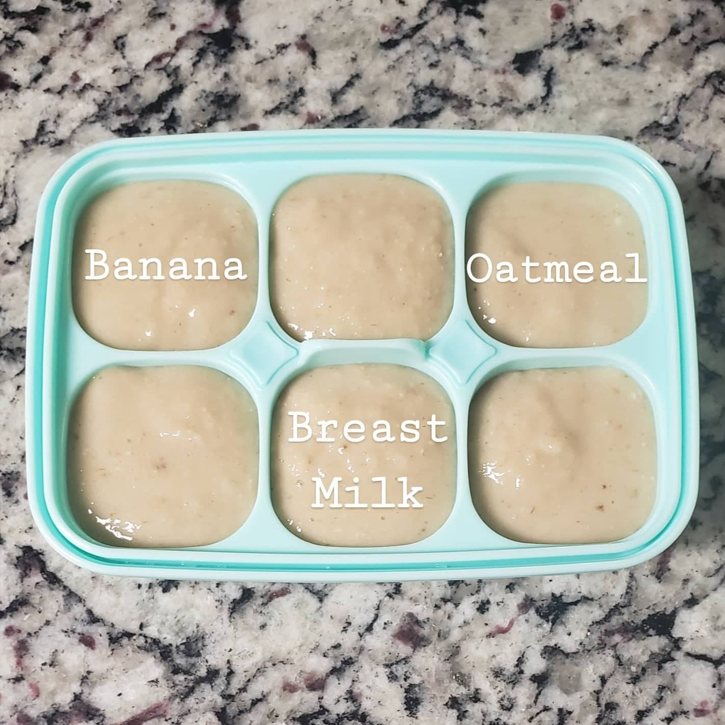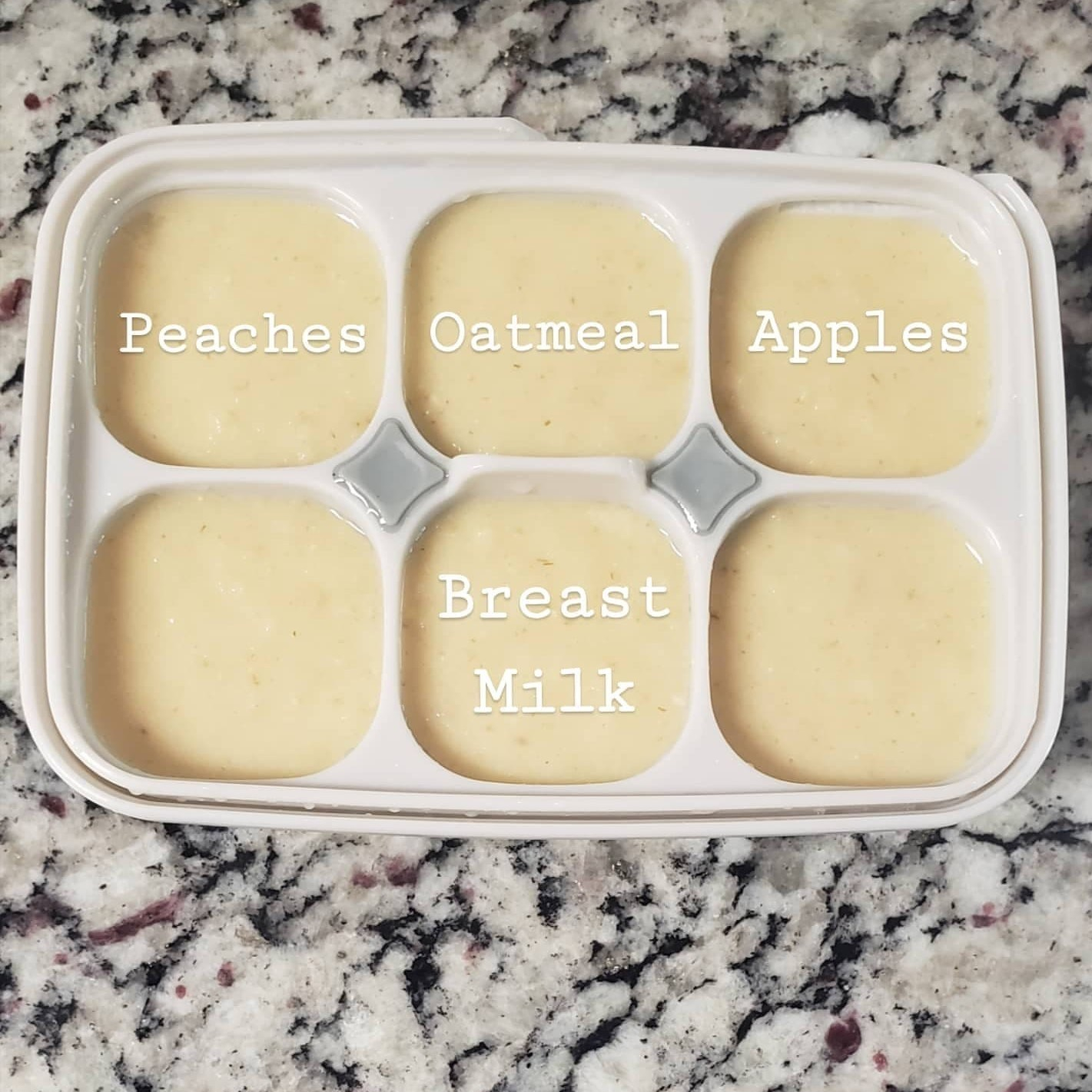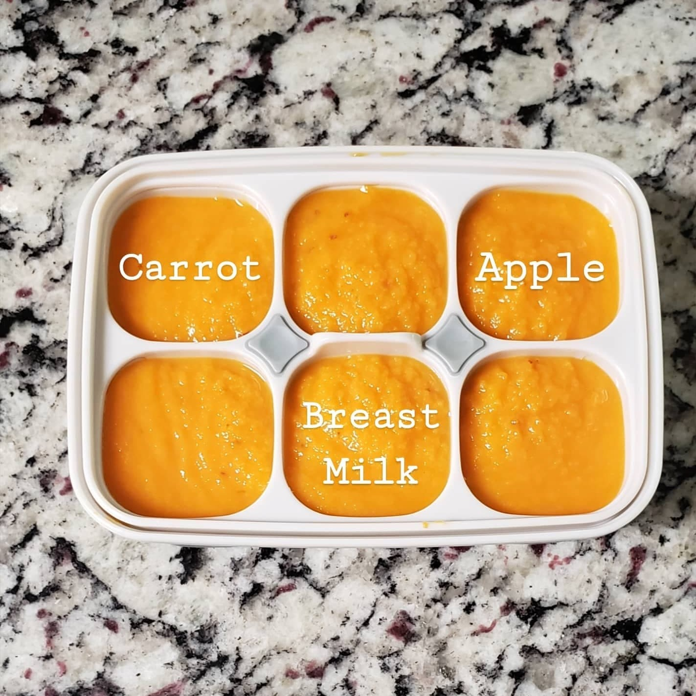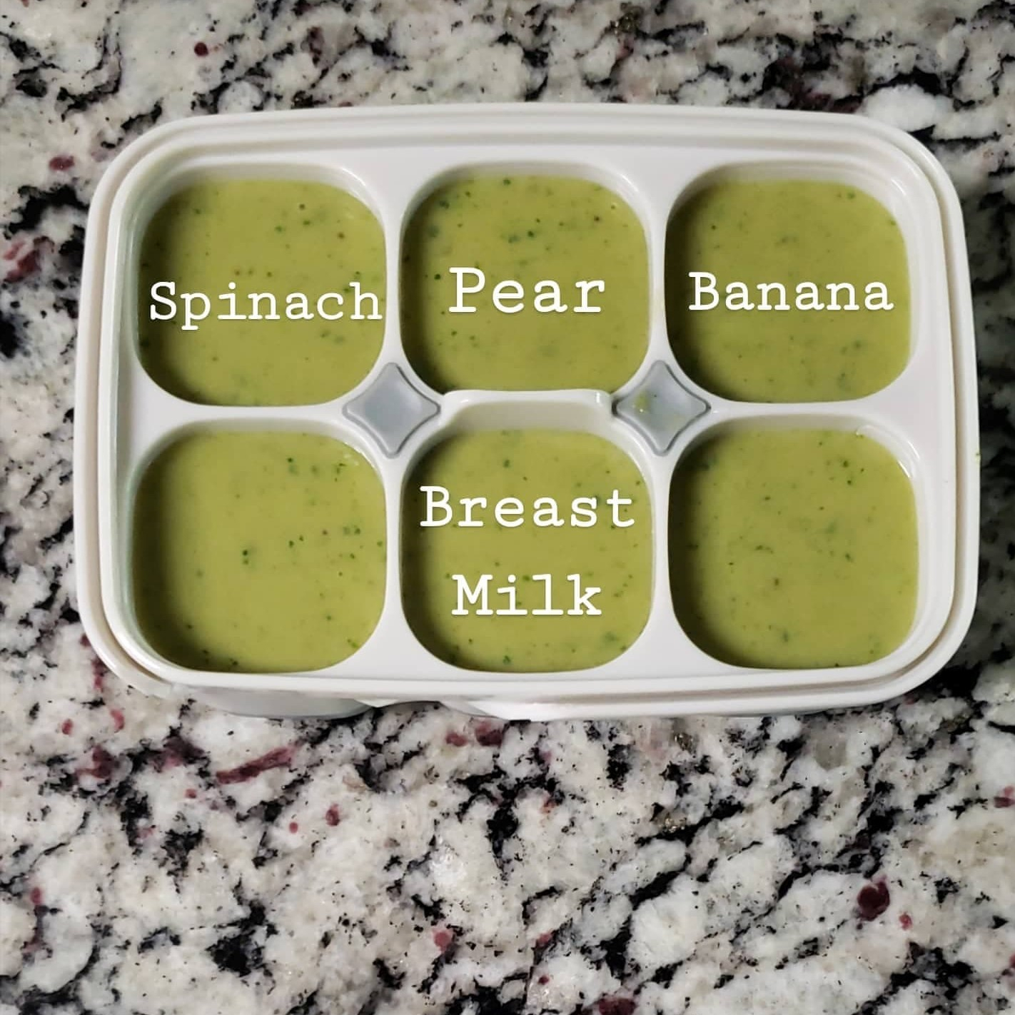 I love making homemade baby food! I use a ninja bullet to blend a variety of fresh and frozen food with breast milk! Any excuse to give more breast milk to my little one! Each of these containers are 12 oz (six 2oz pods) and I put about 5oz of breast milk in each batch. I freeze the pods and take out what I will need for the next day and put it in the fridge before bed. I use fresh produce whenever possible but frozen or canned fruits and veggies work in a pinch as well! These freezer meals will be good for 3mo in the freezer and she currently goes through about 18oz of food per day (she is 8 months and I am still breastfeeding).