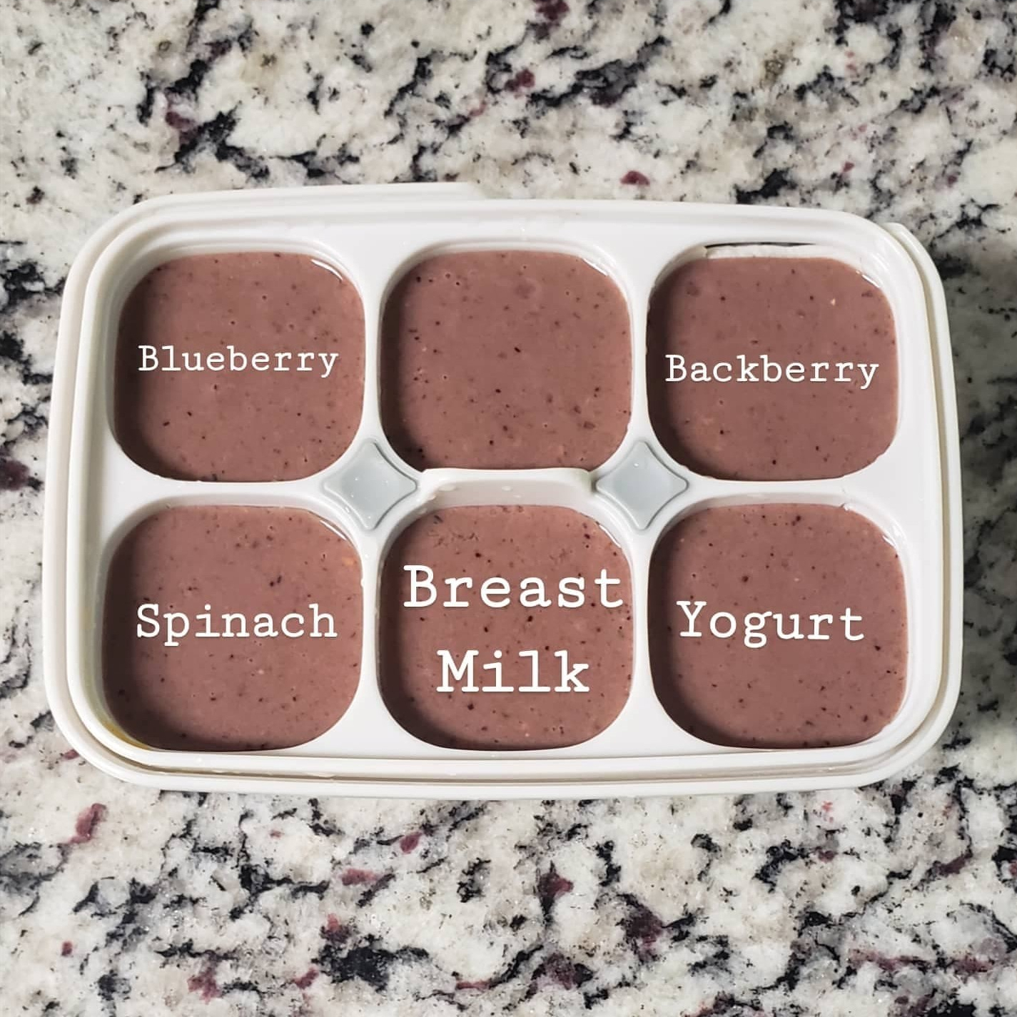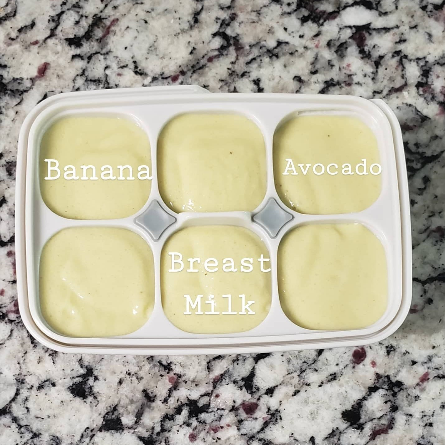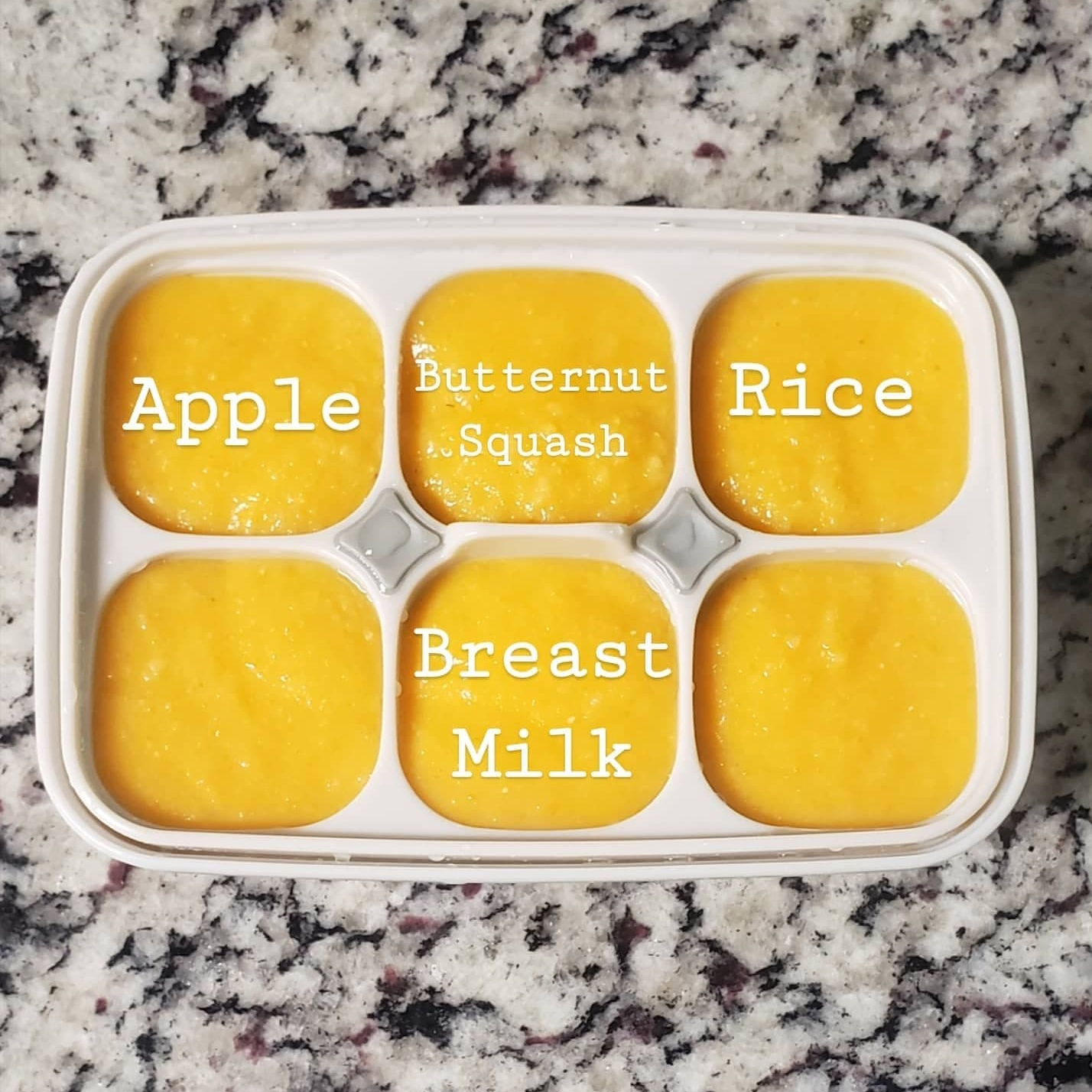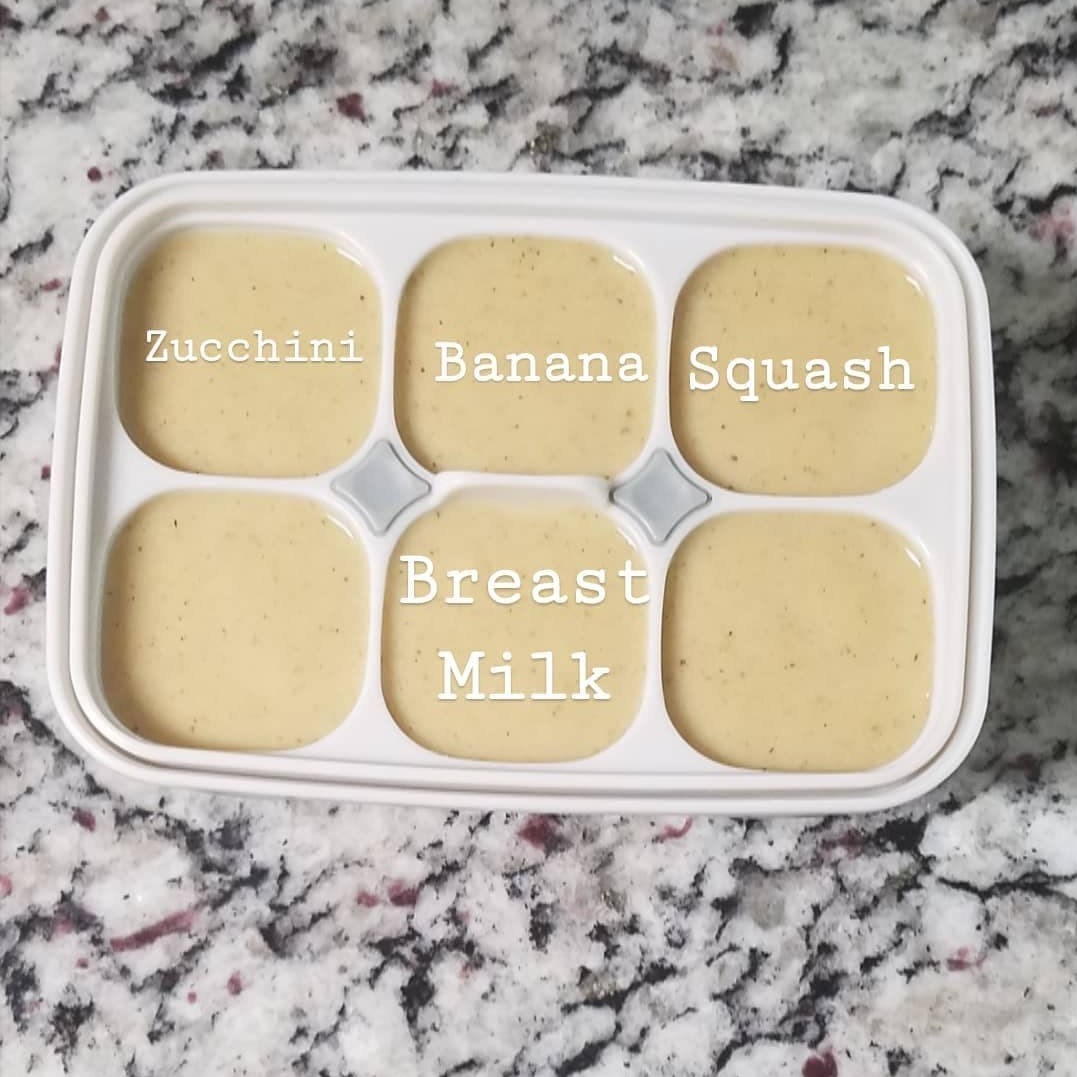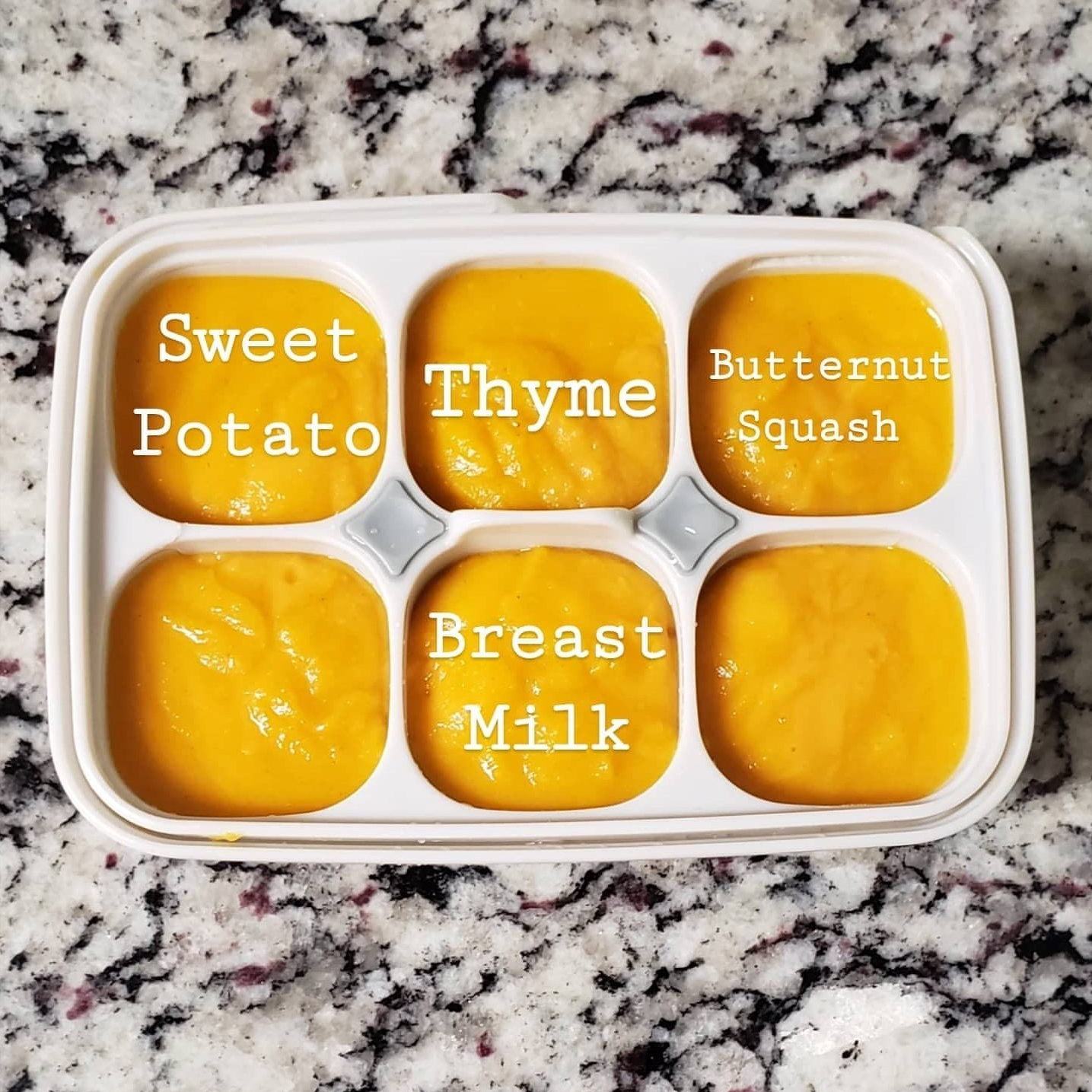I love making homemade baby food! I use a ninja bullet to blend a variety of fresh and frozen food with breast milk! Any excuse to give more breast milk to my little one! Each of these containers are 12 oz (six 2oz pods) and I put about 5oz of breast milk in each batch. I freeze the pods and take out what I will need for the next day and put it in the fridge before bed. I use fresh produce whenever possible but frozen or canned fruits and veggies work in a pinch as well! These freezer meals will be good for 3mo in the freezer and she currently goes through about 18oz of food per day (she is 8 months and I am still breastfeeding).
